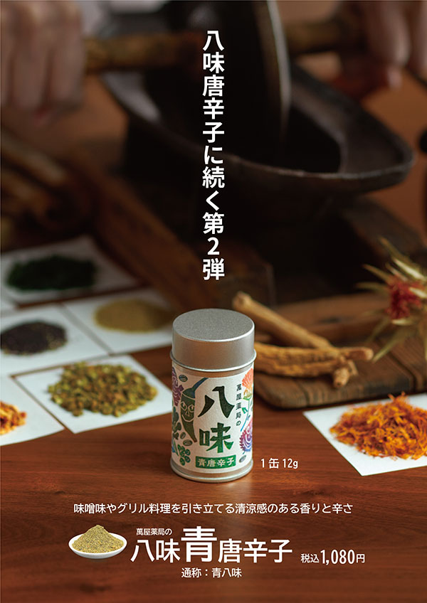 薬研(やげん)で手作業により挽き上げる八味唐辛子「萬屋薬局の八味唐辛子(赤)」に続く第2弾として、青唐辛子を主役にした新商品「萬屋薬局の八味青唐辛子(通称:青八味)」を、2026年2月2日(月)より発売いたします。