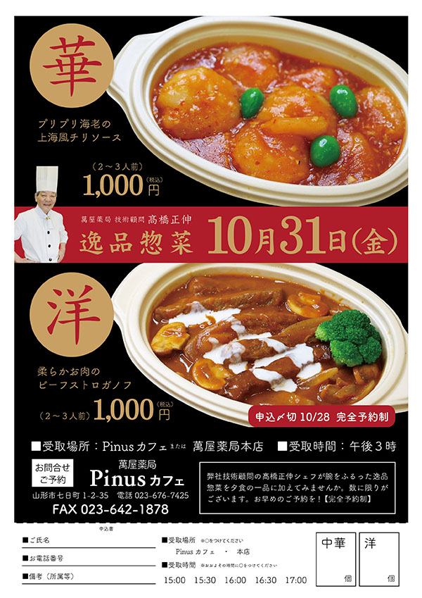 ■受取場所:Pinusカフェ または 萬屋薬局本店 ■受取時間:午後3時~