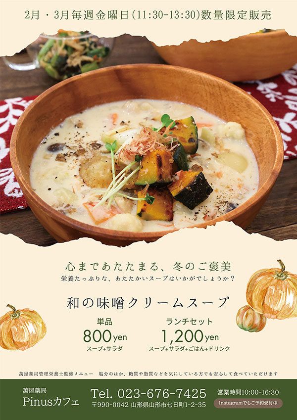 ◎提供場所:萬屋薬局Pinusカフェ(萬屋薬局七日町店併設)山形市七日町1-2-35