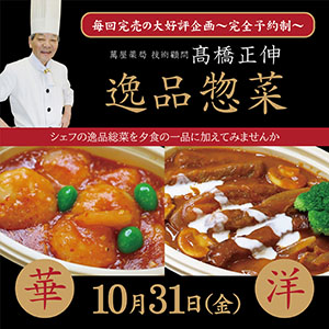 毎回完売の大好評企画『逸品薬膳料理』、今回はお客様からのご要望にお応えし、単品惣菜として提供させていただきます。 弊社技術顧問である髙橋正伸シェフが腕をふるった逸品中国惣菜を夕食の一品に加えてみませんか。完全予約制となっ < 続きを読む >